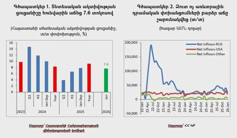 2026 թվականի հունվարին Հայաստանում տնտեսական ակտիվությունը պահպանվել է բարձր մակարդակում, մինչդեռ արտաքին առևտրի ոլորտում գրանցվել է երկնիշ անկում։