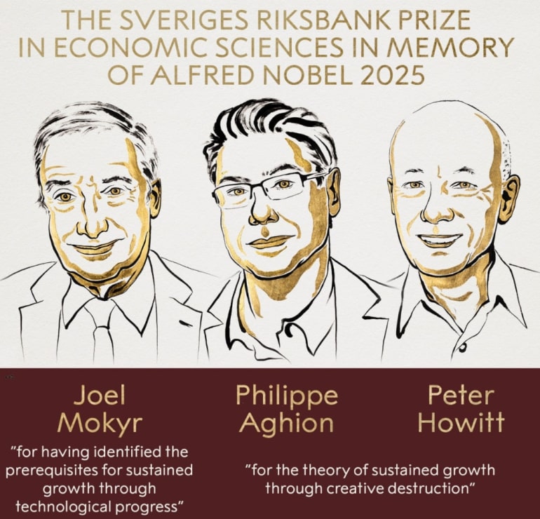 Տնտեսագիտության բնագավառում 2025 թվականի Նոբելյան մրցանակը շնորհվել է Նիդերլանդներից Ջոել Մոկիրին, ֆրանսիացի Ֆիլիպ Ագիոնին և կանադացի Պիտեր Հովիթին՝ «նորարարությունների վրա հիմնված տնտեսական աճի բացատրության համար»։ Մասնավորապես, մրցանակի կեսը բաժին է հասել Մոկիրին՝ «տեխնոլոգիական առաջընթացի միջոցով կայուն աճի նախադրյալները բացահայտելու համար», իսկ մյուս կեսը՝ Ագիոնին և Հովիտին համատեղ՝ «ստեղծագործական ոչնչացման միջոցով կայուն աճի տեսության համար»։