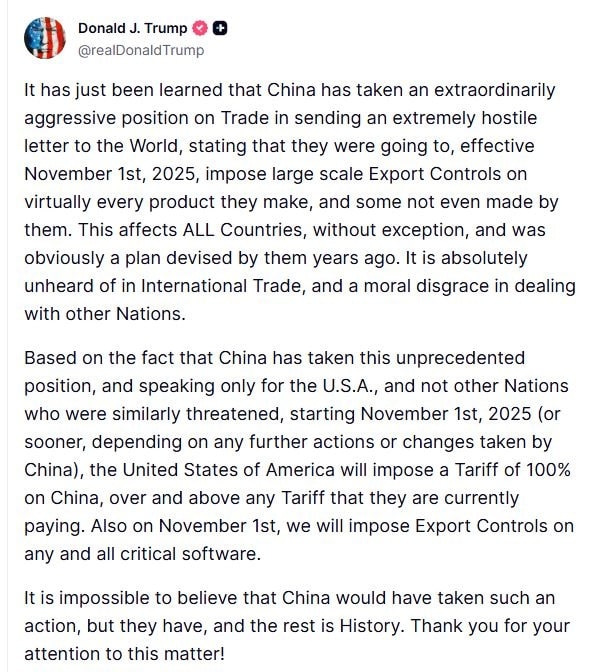 «Սկսած 2025թ. նոյեմբերի 1-ից (կամ ավելի շուտ՝ կախված Չինաստանի հնարավոր հետագա քայլերից), ԱՄՆ-ն Չինաստանի նկատմամբ կսահմանի 100% մաքսատուրք՝ գոյություն ունեցող բոլոր մաքսատուրքերից բացի։ Արտահանման վերահսկողություն կսահմանվի բոլոր կրիտիկական ծրագրային ապահովումների նկատմամբ»,- ասել է նա։